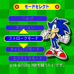 In this game, the player takes control of Sonic and his friends as they play golf. The player goes through a nine-hole course. Good shots earn Rings which can be used to purchase additional clubs, balls, accessories, special shots, and playable characters. In addition to the normal game, there is a training mode and download shop for swapping out courses. The game also has an online ranking; when earning high scores, the player can upload them onto a national scores table.