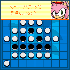 A Sonic the Hedgehog Reversi simulation game. The player plays as Sonic and faces off against other Sonic characters such as Tails, Amy, and Chao. The player is given three Rings a day, with each match costing a Ring.
