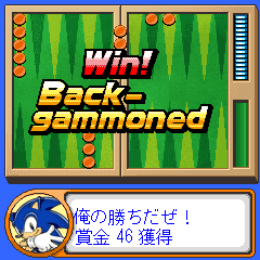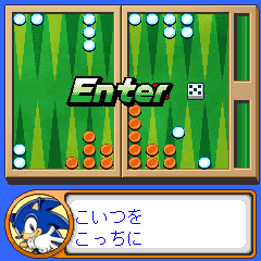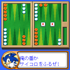 A Sonic themed backgammon game. In this game, the player plays as Sonic in a game of backgammon against Dr. Eggman. Sonic plays as the white pieces, with Eggman then being the orange ones.
