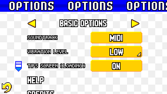 This page contains the Soundtrack (MIDI and GBA MIX), Vibration Level and Tips Screen (Loading) options.