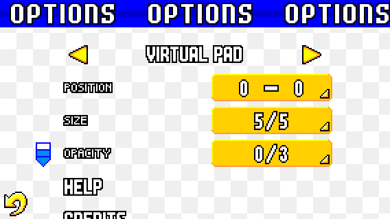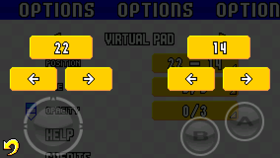 The POSITION option lets you change the horizontal position of both the circle pad (on the left) and the A/B buttons (on the right). The maximum position value depends on the aspect-ratio of your device and the size of the virtual pad.