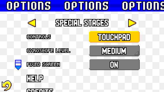 This page is dedicated to the Special Stages. You can change the Special Stage Controls, Gyroscope Level and Fixed Screen options. If you set the Controls to GYROSCOPE, you can access the Gyroscope Level.