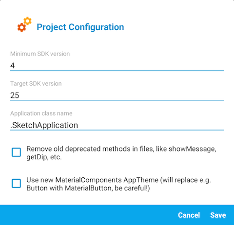 The Configuration menu is mostly used to change the SDK version number, though for modern Android compatibility purposes, it is recommend to keep the SDK versions as they are.