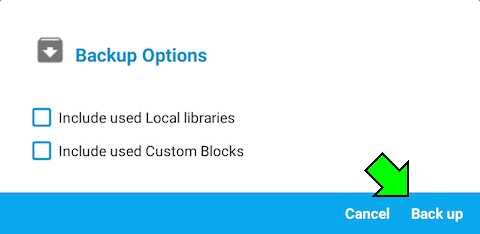The Back up menu allows you to back up and save your project on your device. The backed up project is located as a .swb file in ".sketchware/backups/project name".
