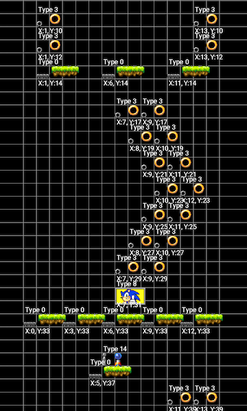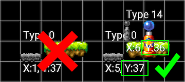 Some object placements are determined by gray sprites next to the visual object sprite to illustrate the accurate in-game object postions.