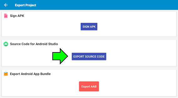 The Sing/Export menu lets you sign the .apk file or export the source code for Android Studio. Once the exportation is done, the local path of the exportation is displayed.